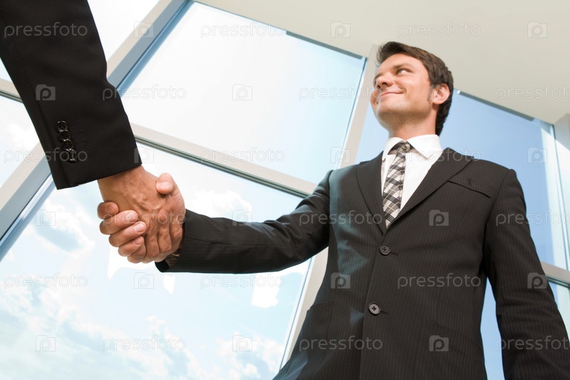 Ниже вид счастливого мужчины, обнимающего руку со своим партнером после заключения деловой сделки