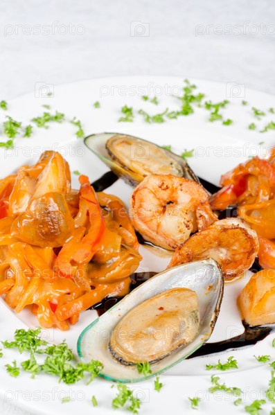 Креветки, мидии и кальмары на блюде