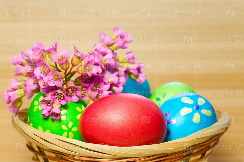 Крашенные пасхальные яйца с цветком бадана в плетеной корзине