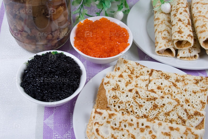 Блинчики с красной и черной икрой. Русский праздничный стол на Масленицу
