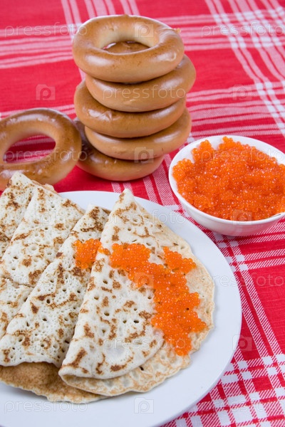 Блинчики с красной икрой и бублики. Русский праздничный стол на Масленицу
