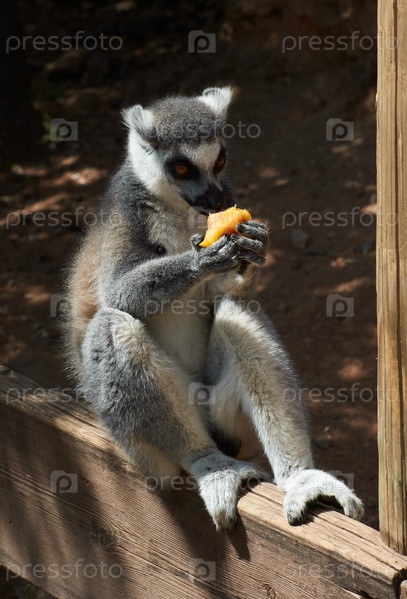 Лемур ест фрукт. Иерусалимский Библейский зоопарк. Израиль