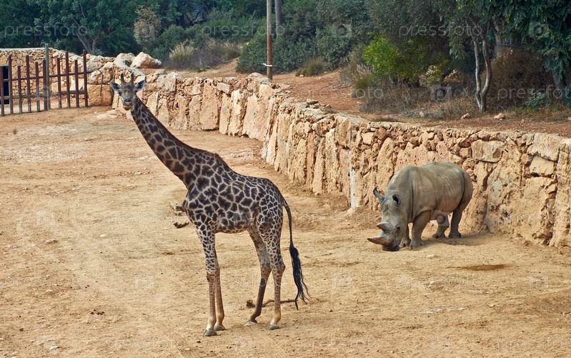 Жираф и носорог в Библейском зоопарке, Иерусалим. Израиль