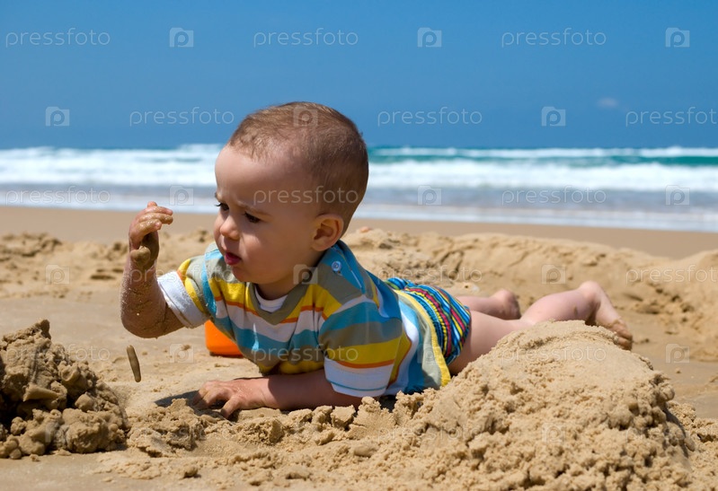 Годовалый ребенок играет с песком на пляже