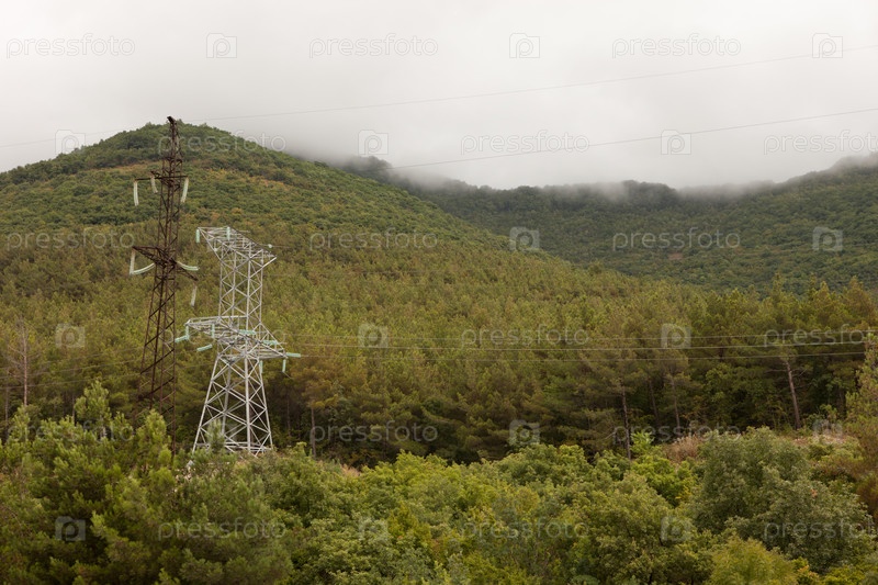 Опоры ЛЭП на фоне гор и леса