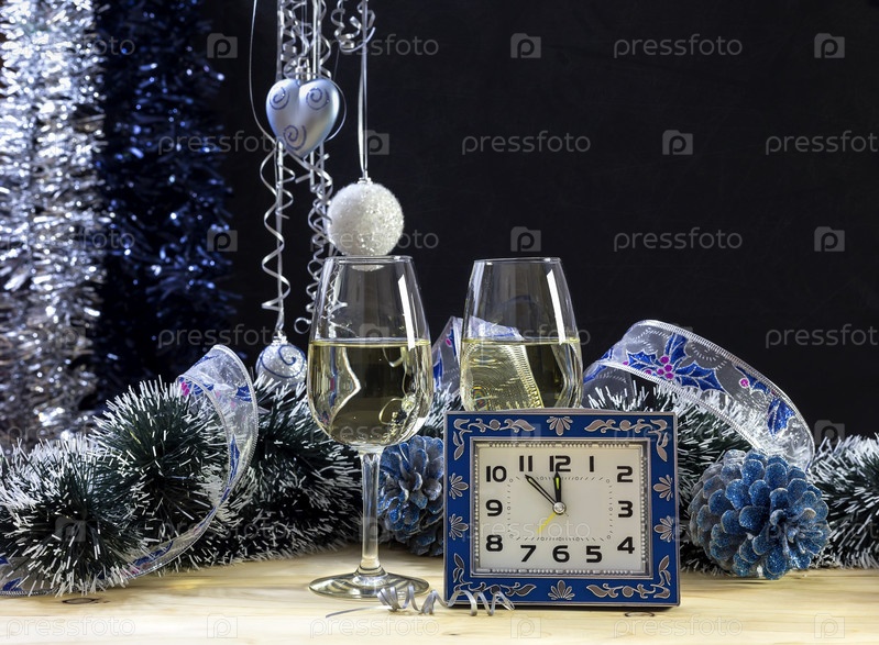 Новогодняя композиция с бокалами и часами