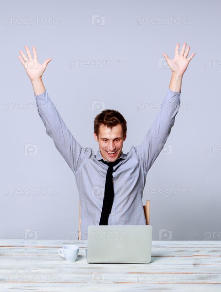 Счастливый человек, работающий на ноутбуке в офисе