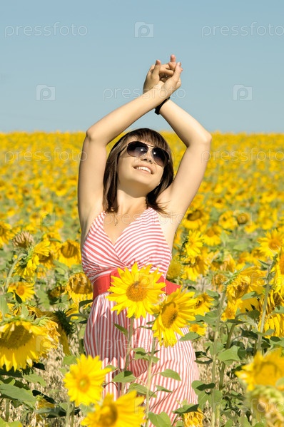 Красивая женщина в поле подсолнухов