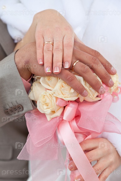 Руки молодоженов на свадебном букете