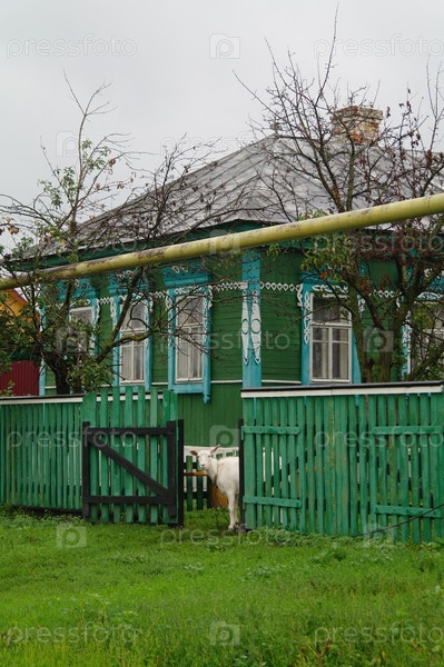 Домашняя коза на привязи около частного дома