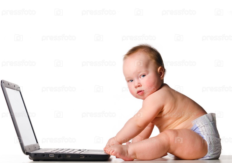 Маленький ребенок работает на ноутбуке на белом фоне