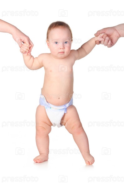 Маленького ребенка держат за руки на белом фоне
