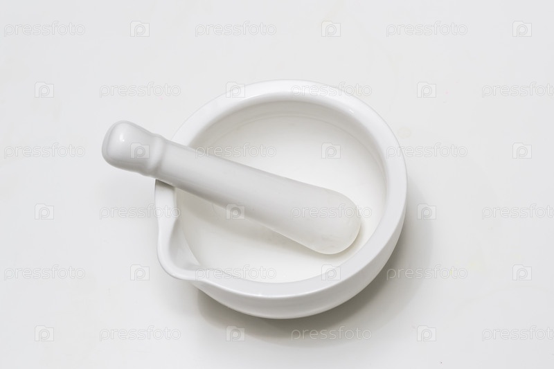 Белая керамическая ступка и пестик, изолированные на белом фоне
