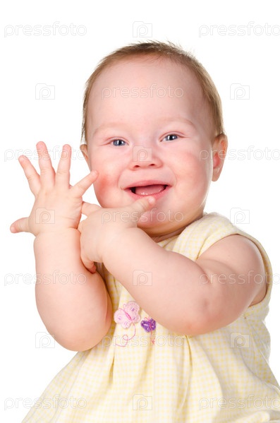 Маленький ребенок улыбается, сидя на белом фоне