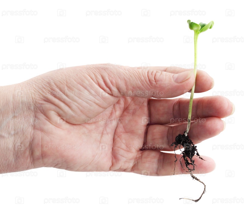Зеленый саженец в руке пожилого человека на белом фоне