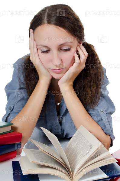 Девушка читает книги на белом фоне