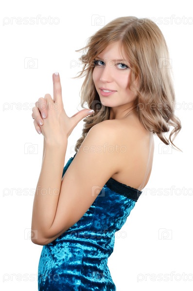 Светловолосая девушка в платье на белом фоне изображает руками пистолет