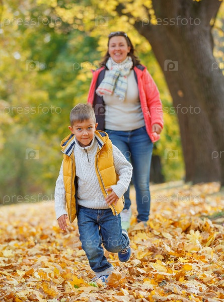 Прелестный мальчик со своей матерью в Осеннем парке