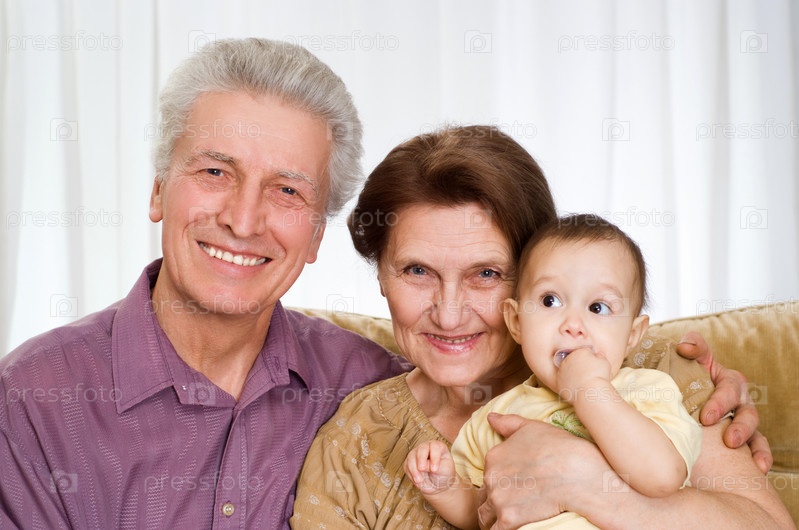 Бабушка, дедушка и ребенок на белом фоне, семейный портрет