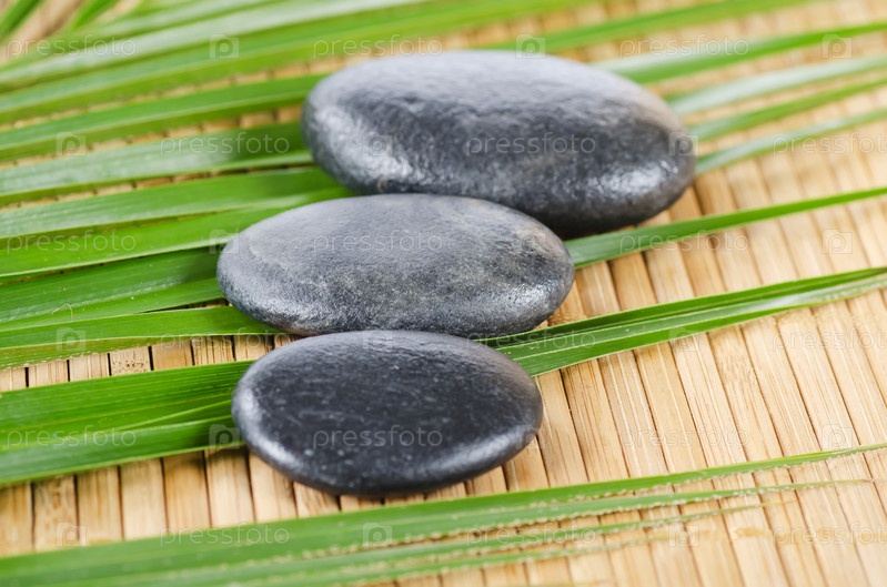 Черные камушки на циновке с бамбуком