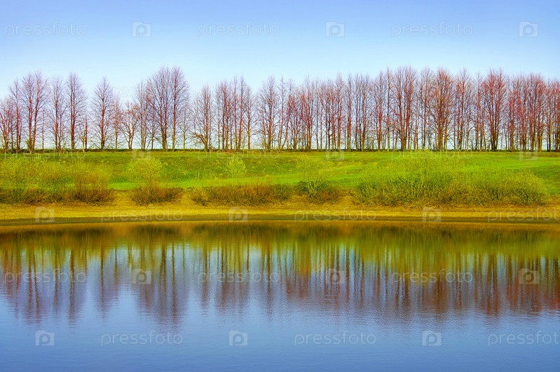 поляна; лес; пруд; синий; небо; зеленый; травы; кусты; отражение; дерево; осенью; природа