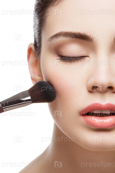 Красивая веселая девушка наносит румяна кистью