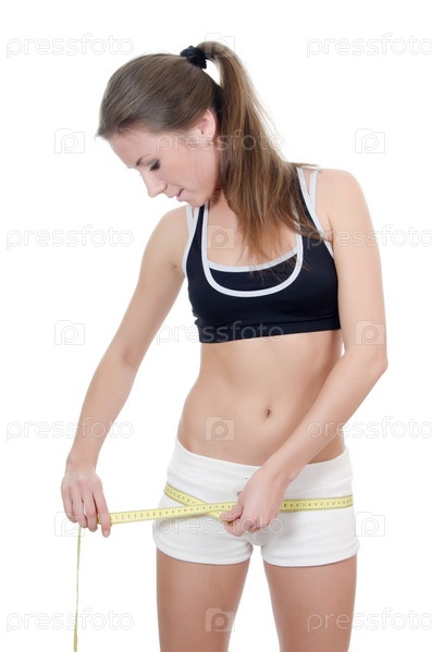 Девушка измеряет бедра сантиметровой лентой на белом фоне
