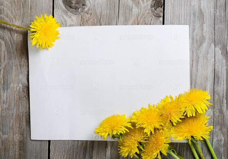 Лист бумаги и желтые одуванчики