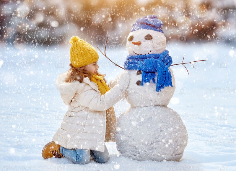 Девочка играет со снеговиком