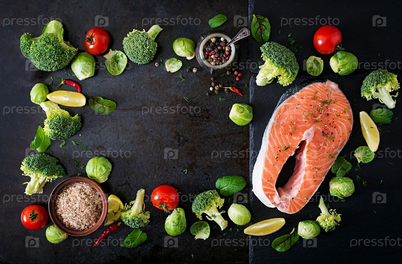 Сырой стейк из семги и овощи