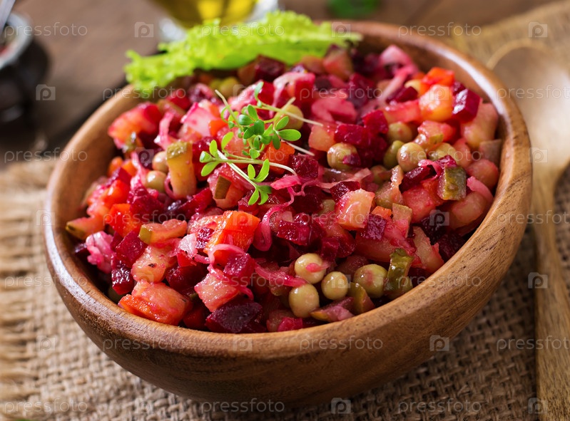 Винегрет в деревянной миске