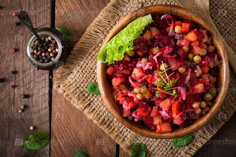 Винегрет в деревянной миске