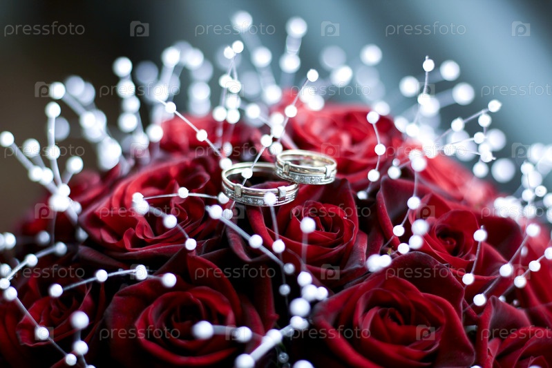 Свадебный букет из роз и обручальные кольца