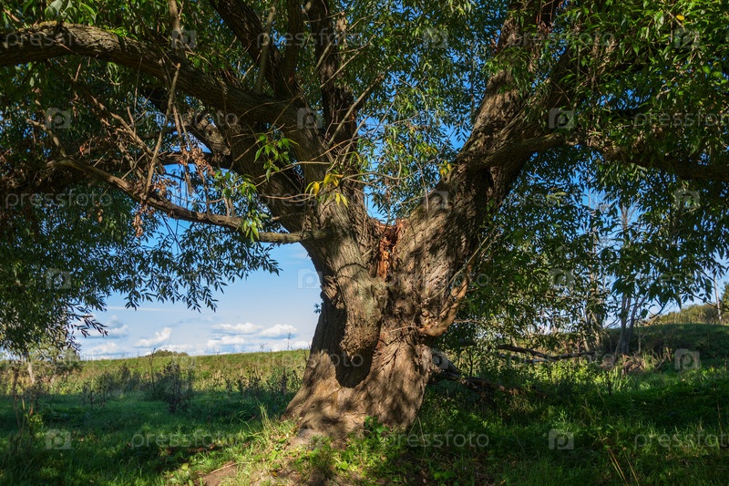 Большое дерево с зеленой листвой,ствол треснул. На фоне поля