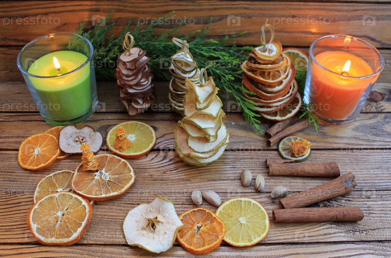 Рождественские елки композиция ручной работы из сухофруктов яблоко, груша, апельсин, лимон