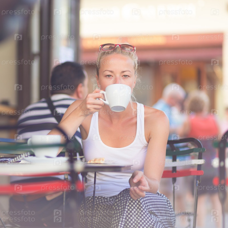 Девушка пьет кофе в кафе на открытом воздухе