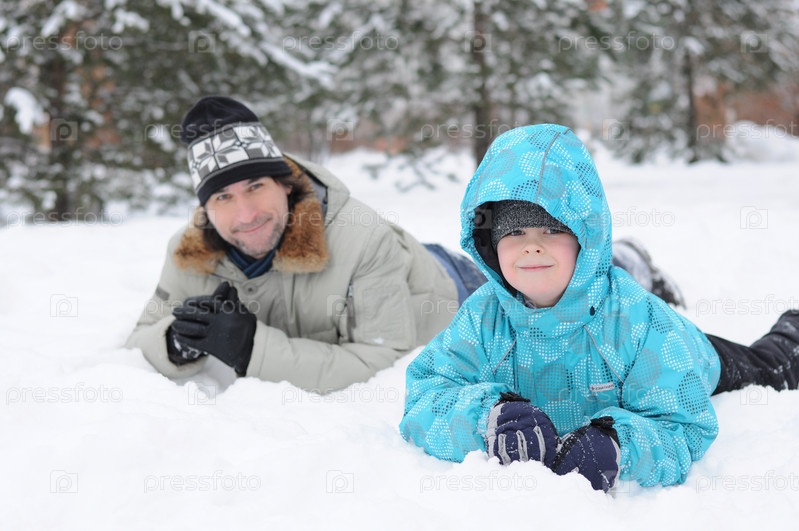 Отец и сын отдыхают в зимнем парке