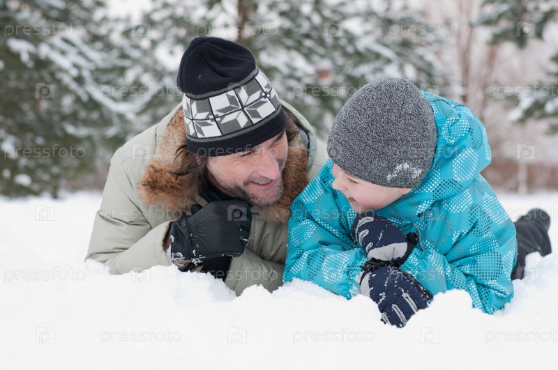 Отец и сын отдыхают в зимнем парке