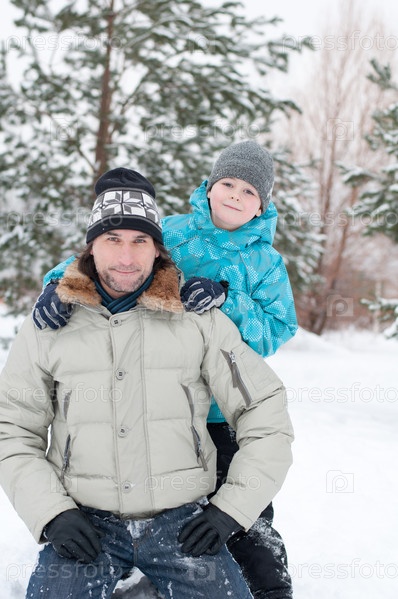 Отец и сын отдыхают в зимнем парке