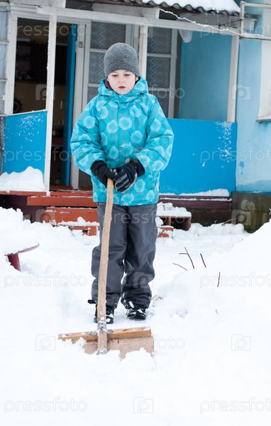 Мальчик чистит снег у дома