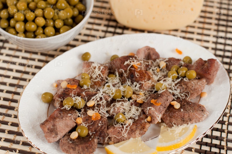 Жареная баранина с сыром и зеленым горошком
