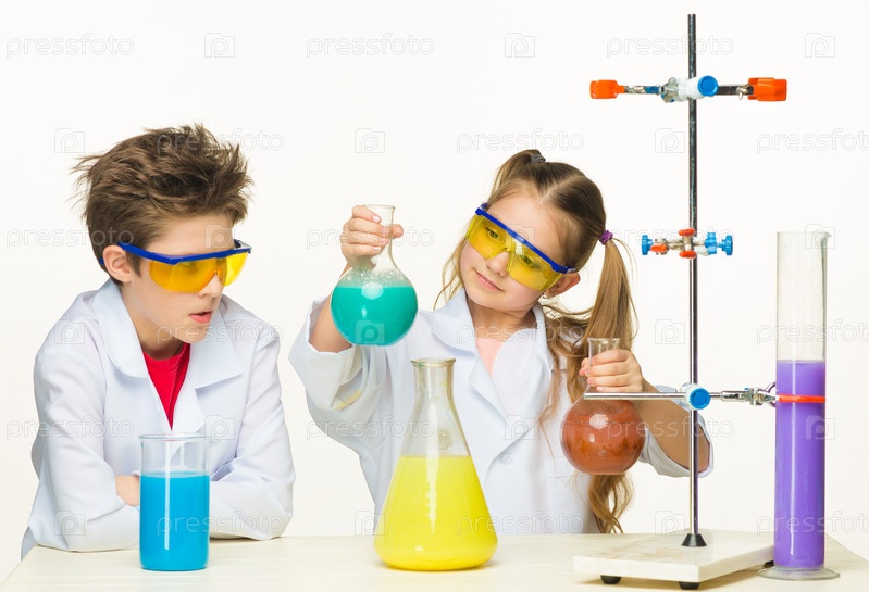 Две милые дети на уроке химии, делая эксперименты
