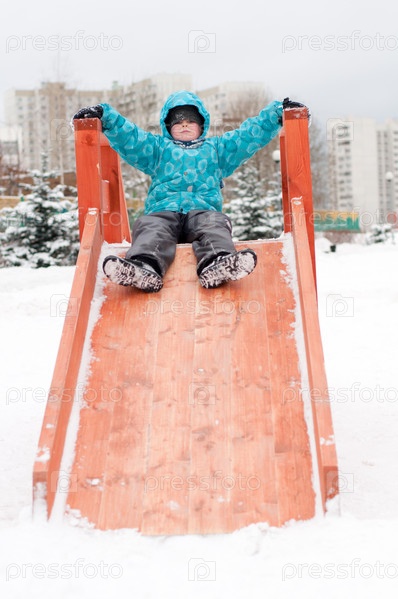 Мальчик катается с горки, зима
