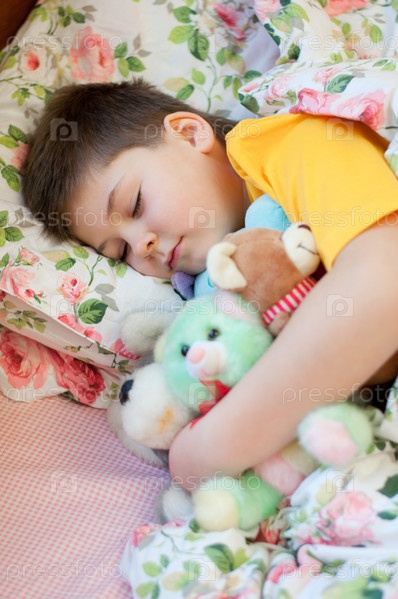 Мальчик спит с мягкими игрушками