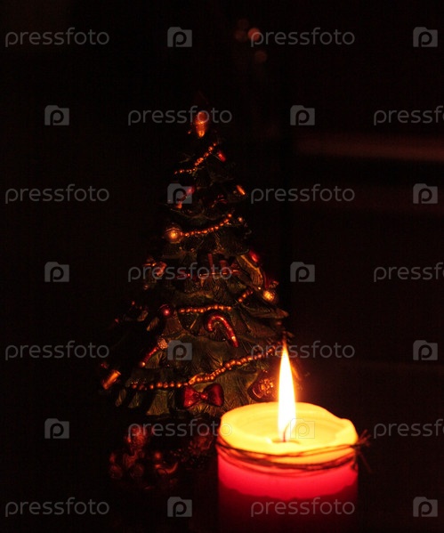Горящая свеча рядом с елкой