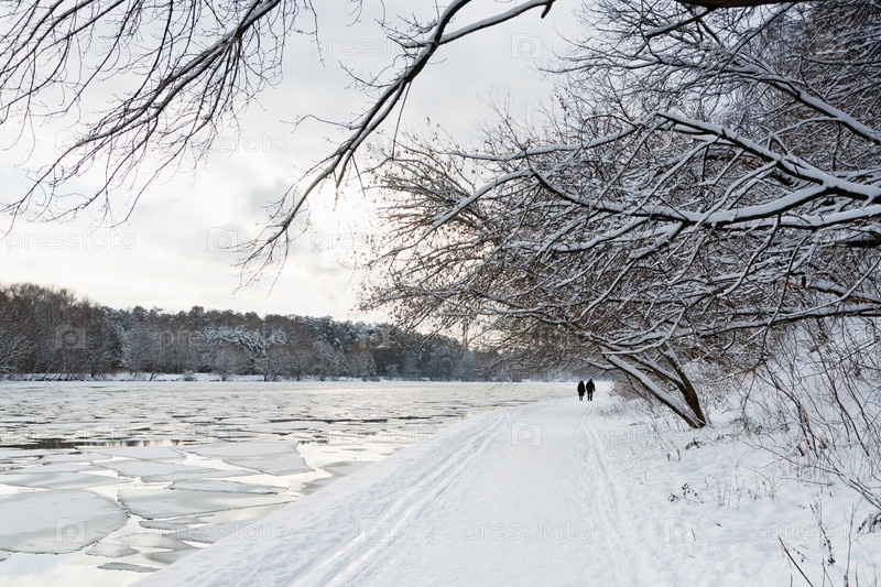 Пешеходная дорожка вдоль реки со льдом вечером
