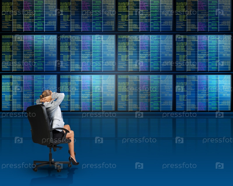 Бизнес-леди в кресле перед экранами