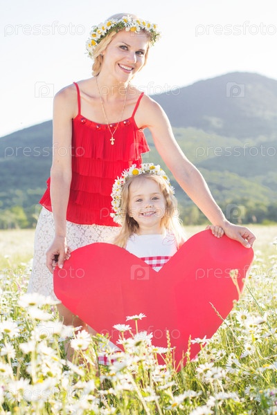 Мать и дочь в ромашковом поле с бумажным сердцем