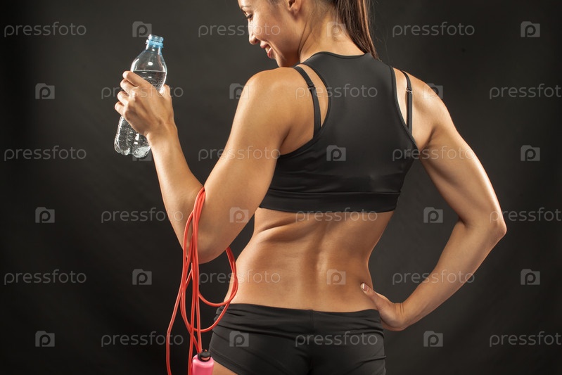 Спортсменка со скакалкой и бутылкой питьевой воды