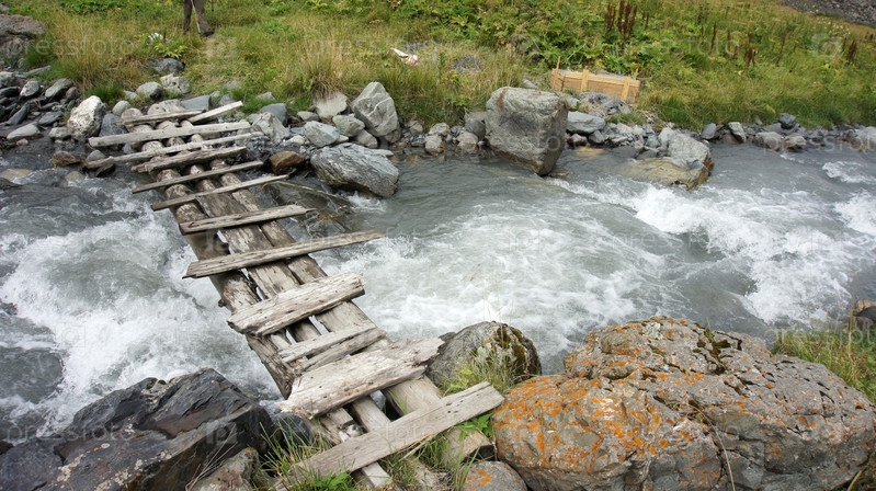 Старый мост древесины на горной реке